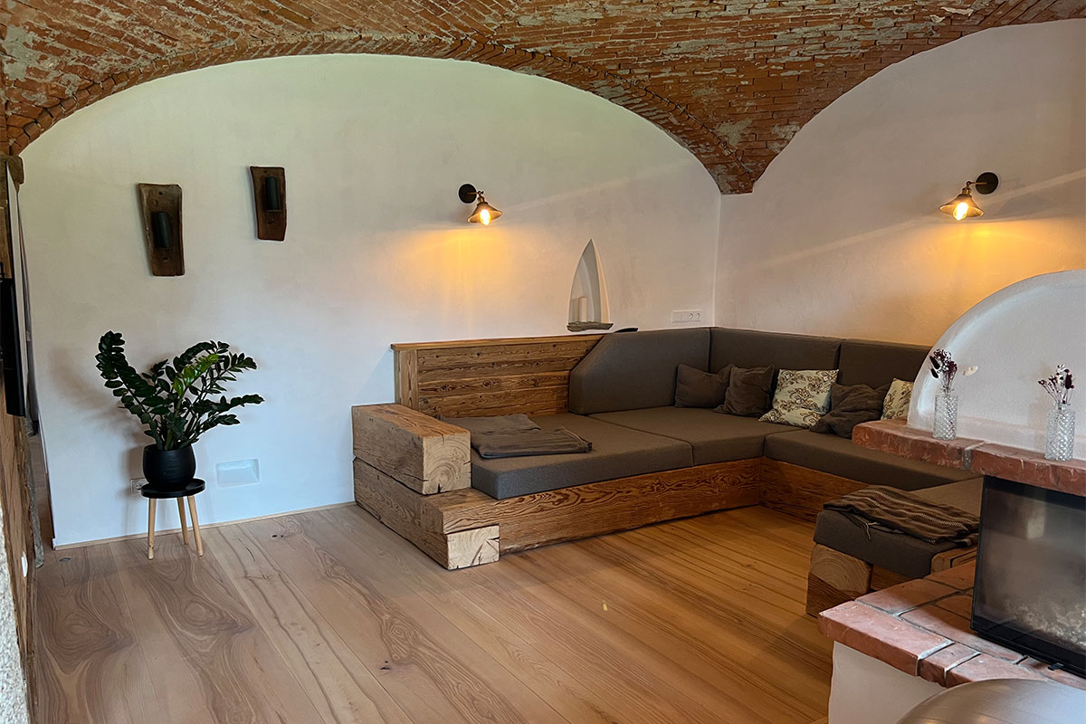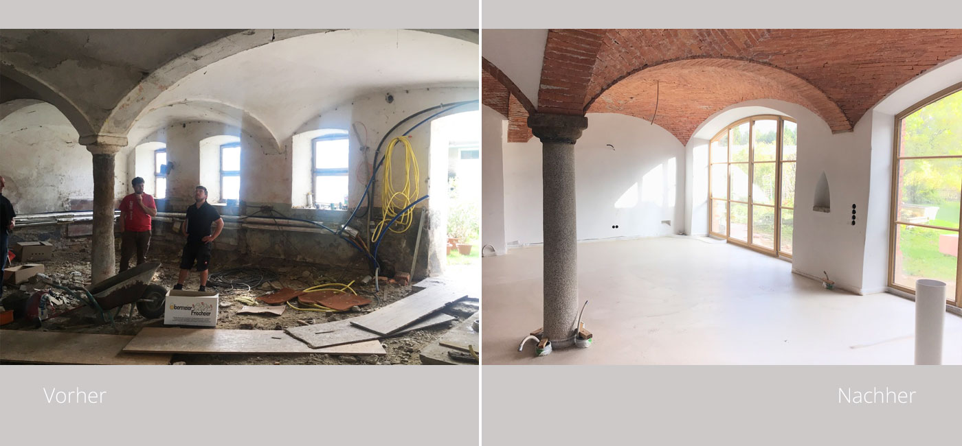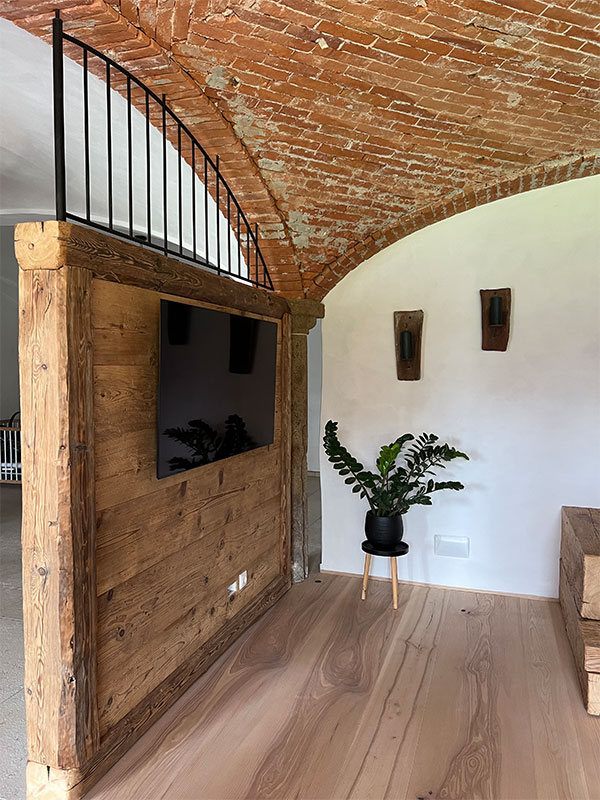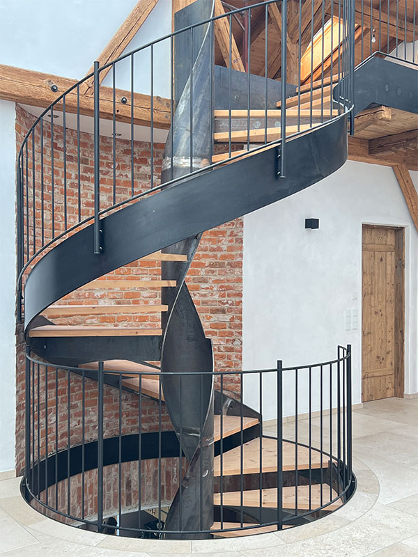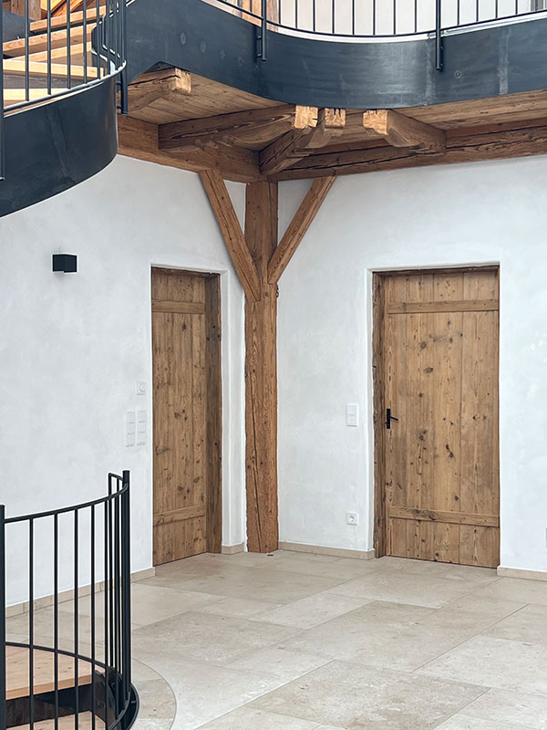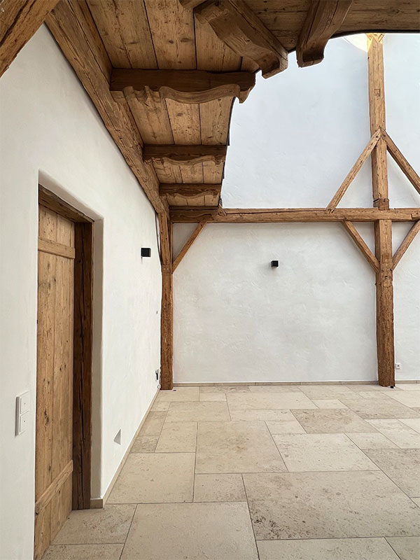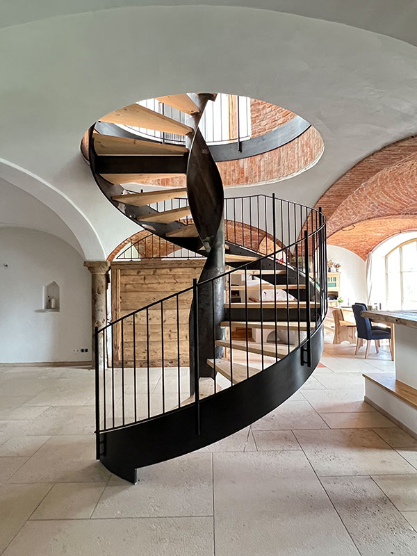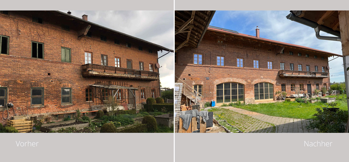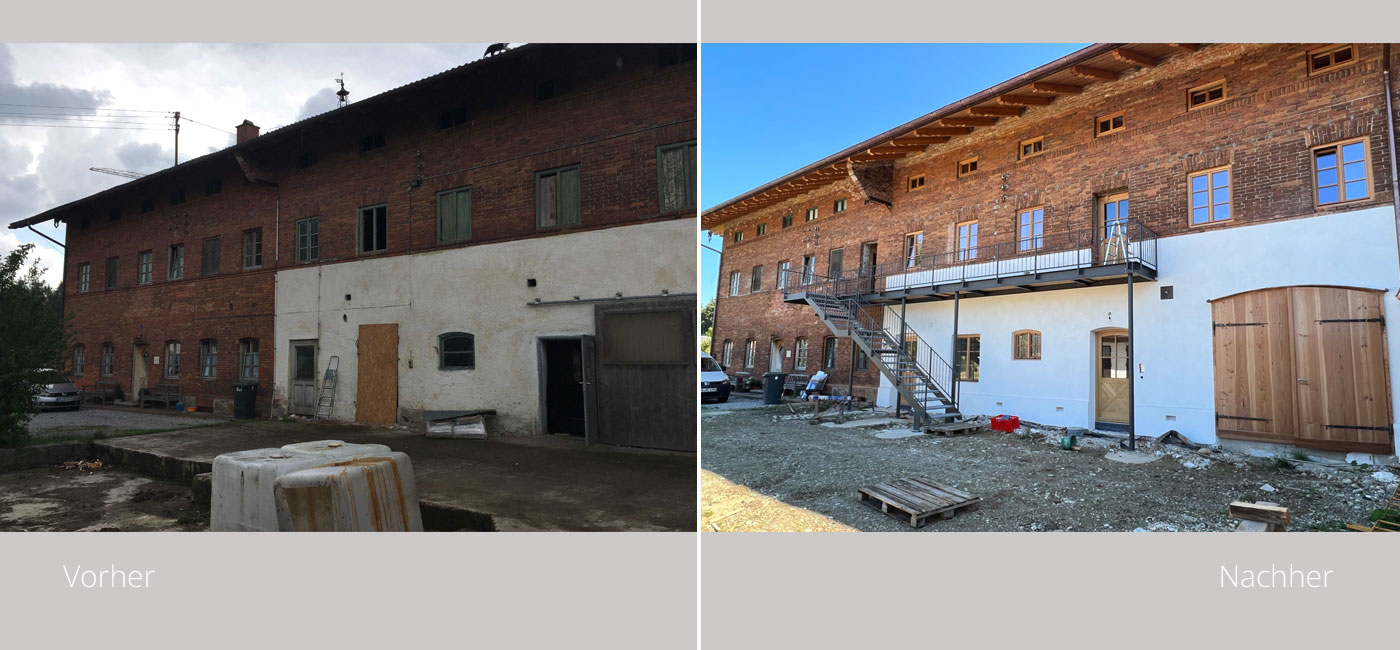 Im 19. Jahrhundert kamen Saisonarbeiter regelmäßig in den Chiemgau und bauten stattliche Höfe, die etwas anders aussahen als die anderen Bauernhöfe. Die Einheimischen tauften sie „Itakerhöfe“ - in Erinnerung an die italienische Herkunft der Bauleute (Quelle: BR24)Ein Teil der großen Scheune sowie der ehemalige Kuhstall mit Gewölbe wurde in eine großzügige dreigeschoßige Wohnung für den Eigentümer des landwirtschaftlichen Betriebes umgebaut. Der Dachfirst wurde mit großflächigen Fenstern versehen. Somit entsteht der gewünschte Effekt einer „Orangerie“. Das Licht fällt über die Spindeltreppe bis in das Erdgeschoß. Die Gewölbedecke des ehemaligen Kuhstalles wurde teilweise frei gelegt, so daß die Originalziegel sichtbar sind. Der vorhandene Dachstuhl wurde weitestgehend erhalten. Eine zusätzliche Wohnung wird über eine neue Außentreppe erschlossen.