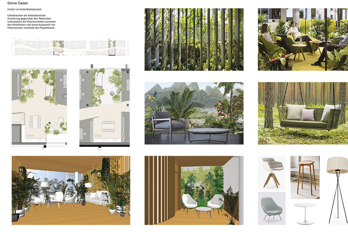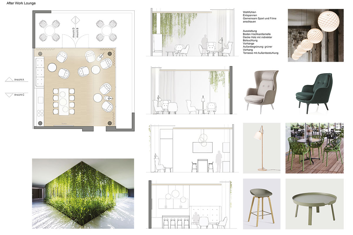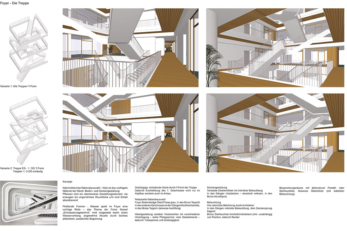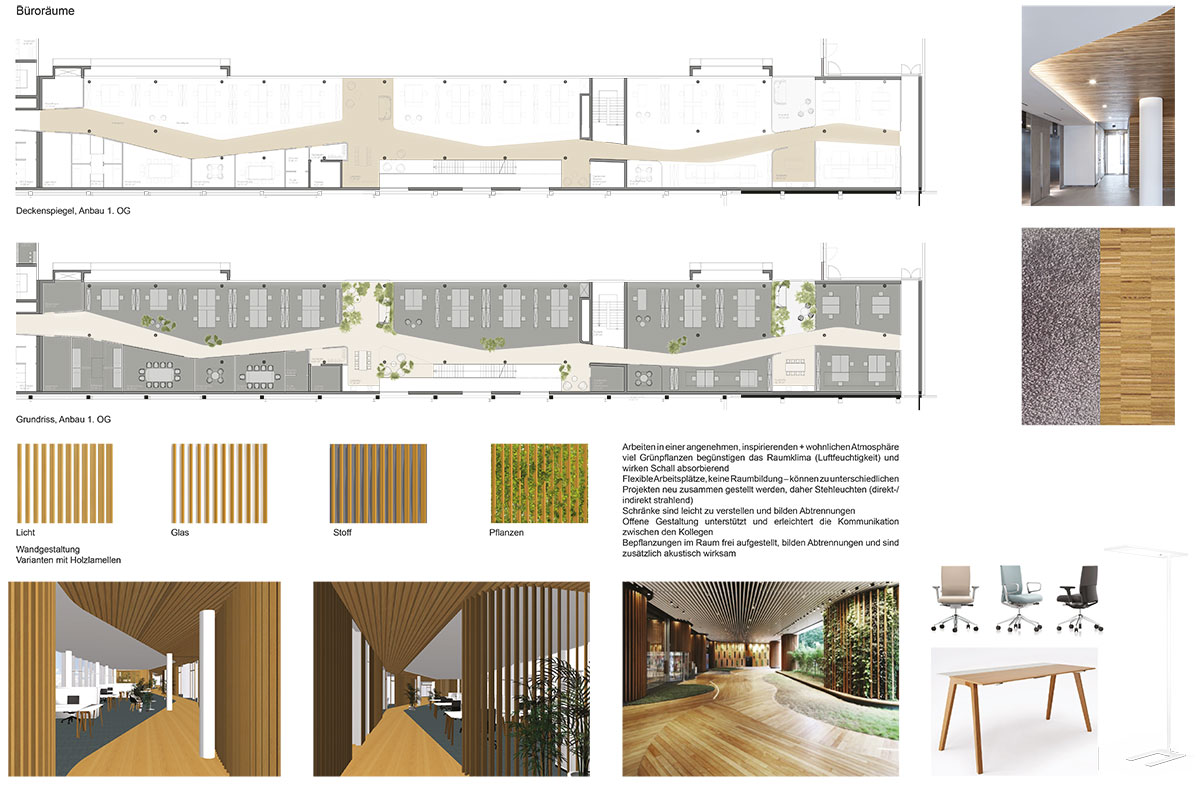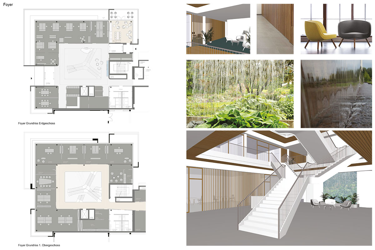 Untersucht wurde die Neugestaltung des Foyers sowie die Umgestaltung der Büro-und Besprechungsbereiche