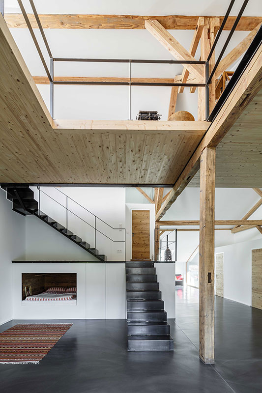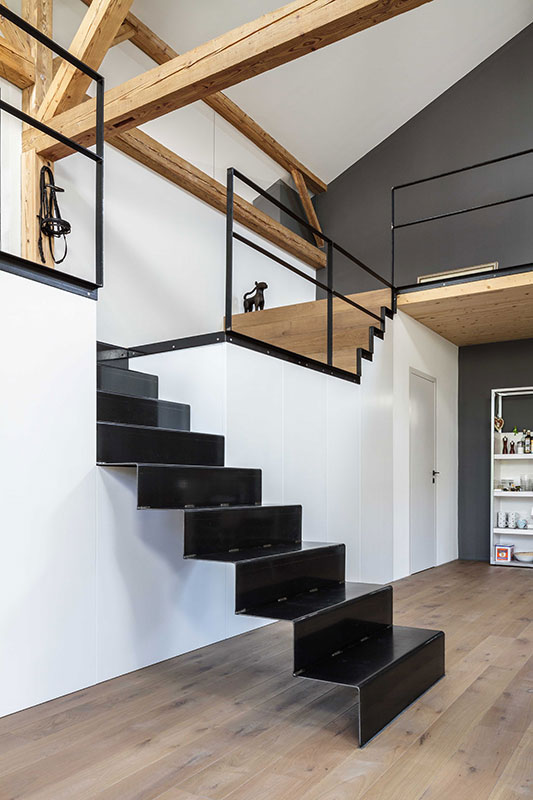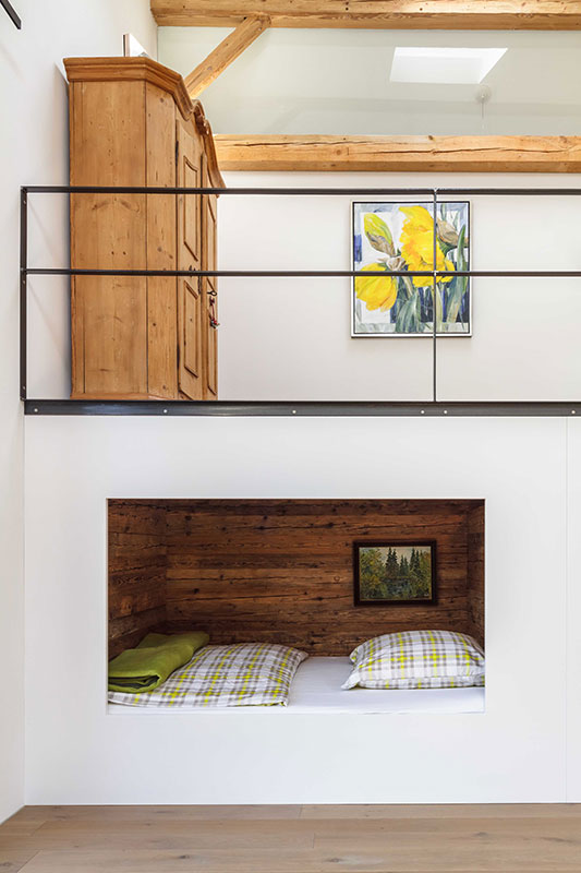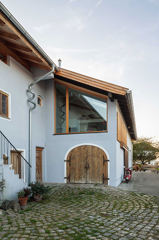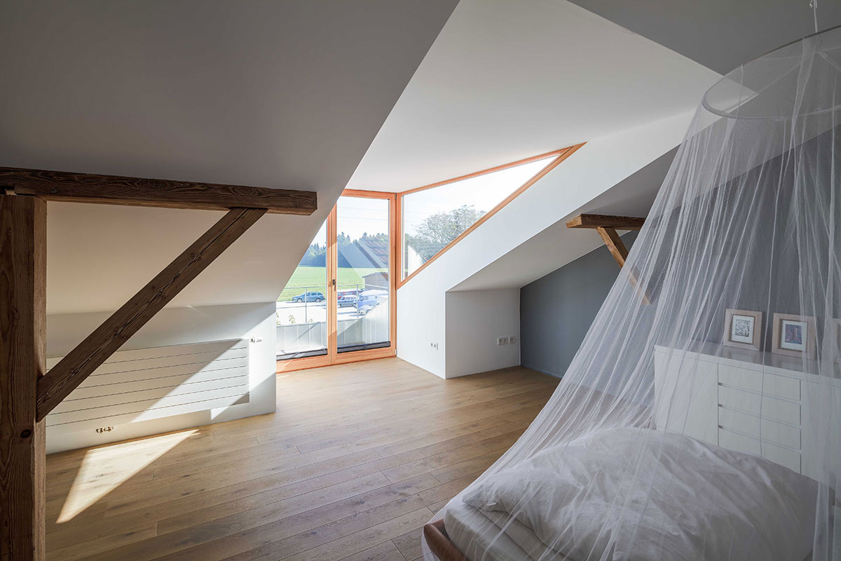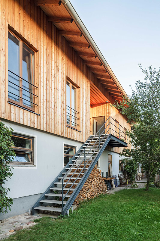 In einem bereits umgebauten ehemaligen Bauernhaus im Chiemgau sind aus der Scheune, die zwischenzeitlich als Schreinerwerkstatt genutzt worden ist, zwei Wohneinheiten entstanden. Wohnung 1 hat eine dreiseitig verglaste Schleppgaube erhalten, um den Bergblick auf die schöne Alpenkette mit der Kampenwand zu erhalten. Wohnung 2 wurde mit einem großen Panoramfenster ausgestattet, das ebenfalls den Blick auf die Berge frei gibt. Die Raumhöhe beträgt bis zu 6 Meter und wurde durch verschiedene Podeste geschickt genutzt. Der Dachstuhl blieb nahezu unverändert, damit die ursprüngliche Nutzung der Scheune erlebbar bleibt.